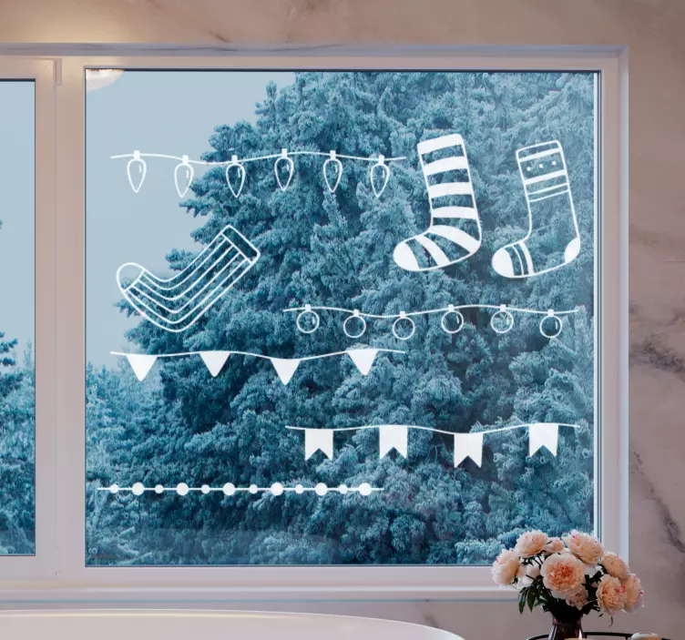 Verleihen Sie Ihrem Zuhause mit unserem Feiertag Wandtattoo Sockenpräsentation eine festliche Note! Das Design kombiniert liebevoll gestaltete Strümpfe und Ornamente, die an eine festliche Girlande erinnern, und wird durch funkelnde Beleuchtung und ein charmantes Banner ergänzt. Dieses Wandtattoo ist der perfekte Fensteraufkleber, um die Weihnachtsstimmung in Ihrem Raum zu verbreiten und Ihre Gäste zu begeistern!