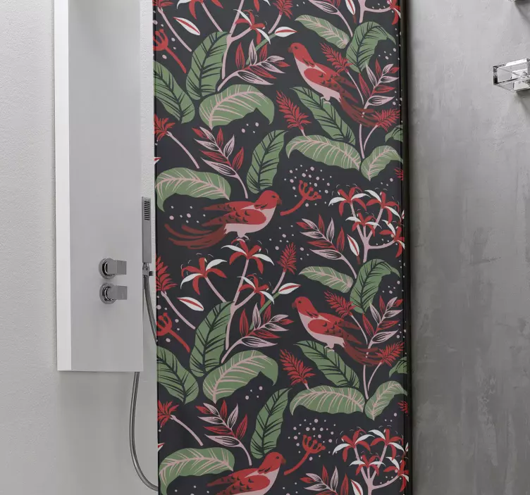 Entdecken Sie die faszinierende Folie Duschkabine botanisches Vogelkonzept, die Ihr Badezimmer in eine Oase der Natur verwandelt! Mit einem harmonischen Zusammenspiel von Blättern, Vögeln, und Blumen erweckt dieses Design den Eindruck eines lebendigen Gartens. Die sanften grünen und roten Farbtöne harmonisieren perfekt und verleihen Ihrem Raum eine frische, beschwingte Atmosphäre, die sowohl belebt als auch beruhigt.