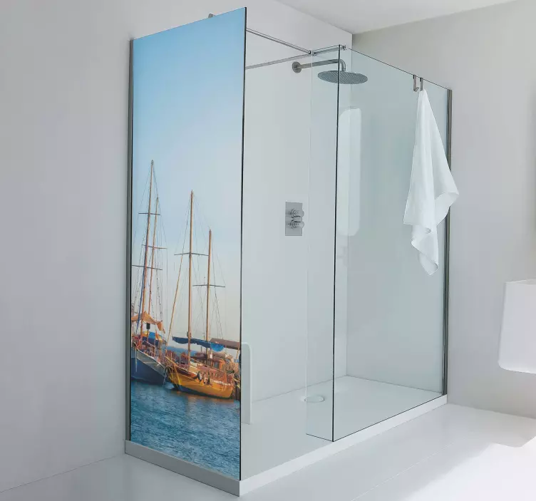 Erleben Sie die maritime Atmosphäre mit unserer Folie Duschkabine Segelboot Szene, die Ihre Dusche in einen bezaubernden Hafen verwandelt. Das Design zeigt anmutige Boote, die sanft auf dem Wasser schaukeln, während die Fotografie die Schönheit des Segelns und die Ruhe der Marine einfängt. Mit diesem einzigartigen Produkt bringen Sie das Gefühl von Freiheit und Abenteuer in Ihr Badezimmer, das Sie jeden Tag aufs Neue inspirieren wird!