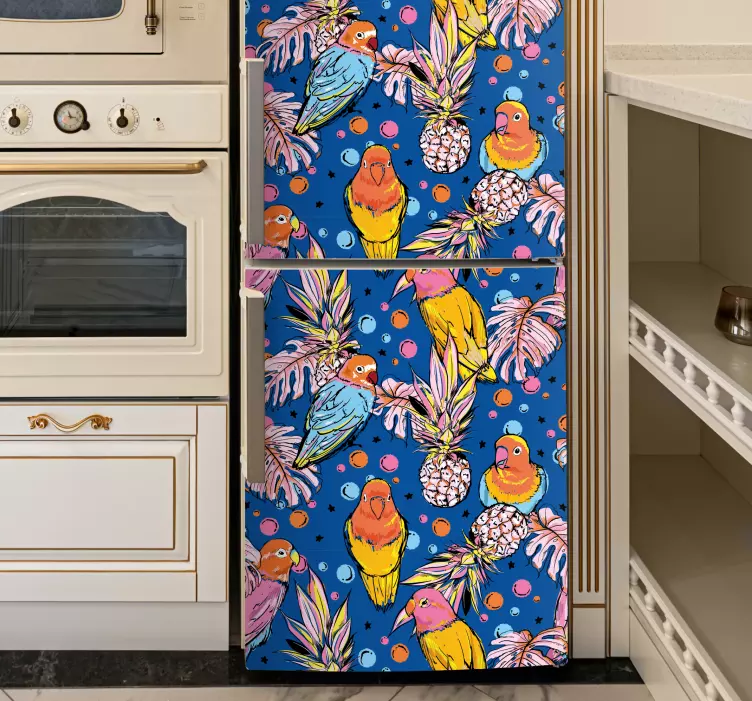 Entdecken Sie die faszinierende Folie Kühlschrank mit buntem Papageien Design, die Ihr Zuhause in eine tropische Oase verwandelt! Das grafische Design zeigt lebendige Papageien umgeben von saftigen Ananas und einem atemberaubenden Muster, das in bunten und leuchtenden Farben erstrahlt. Die harmonische Komposition von Naturmotiven bringt frische und Lebensfreude in Ihre Küche und verwandelt Ihren Kühlschrank in ein dekoratives Highlight.