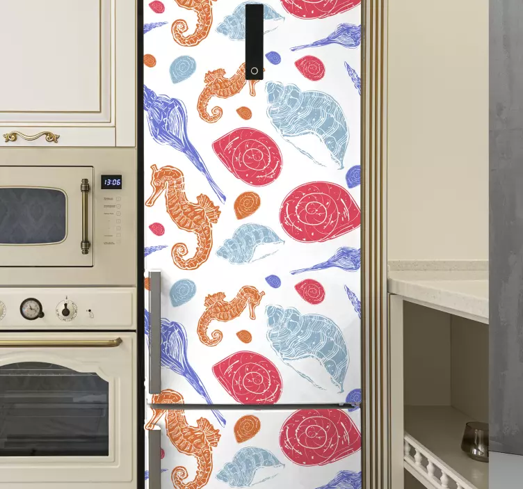 Entdecken Sie die faszinierende Folie Kühlschrank seepferdchen und muscheln, die mit ihrem bunten Design das Leben im Meer direkt in Ihre Küche bringt. Diese kreative Gestaltung zeigt verspielte Seepferdchen und Muscheln, die in einem maritimen Muster lebendig werden. Das fröhliche und farbenfrohe Motiv sorgt für eine erfrischende Atmosphäre und verwandelt Ihren Kühlschrank in ein echtes Kunstwerk.