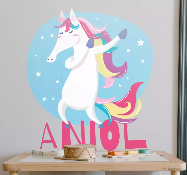Referenz: A47669Ein lebhaftes Einhorn tanzt fröhlich vor einem beruhigenden blauen Hintergrund, umgeben von Sternen. Dieses Design fängt den verspielten Geist der Kindheit und Fantasie ein und ist eine wunderbare Wahl für persönliche Räume. Das Produkt kann personalisiert werden, um eine einzigartige Note hinzuzufügen.