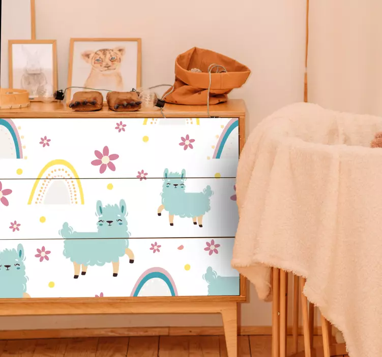 Entdecken Sie unser charmantes Design des Katzen sticker charmantes lama konzept, das mit verspielten Illustrationen von Lamas, bunten Regenbögen und floralen Mustern begeistert. Die grafische Darstellung kombiniert lebendige Farben und eine kreative Zeichnung, die nicht nur Kinderherzen höherschlagen lässt, sondern auch als dekorativer Blickfang in jedem Raum fungiert. Schaffen Sie eine fröhliche Atmosphäre mit diesen einzigartigen Möbelstücken, die Ihrem Zuhause einen Hauch von Farbe verleihen!