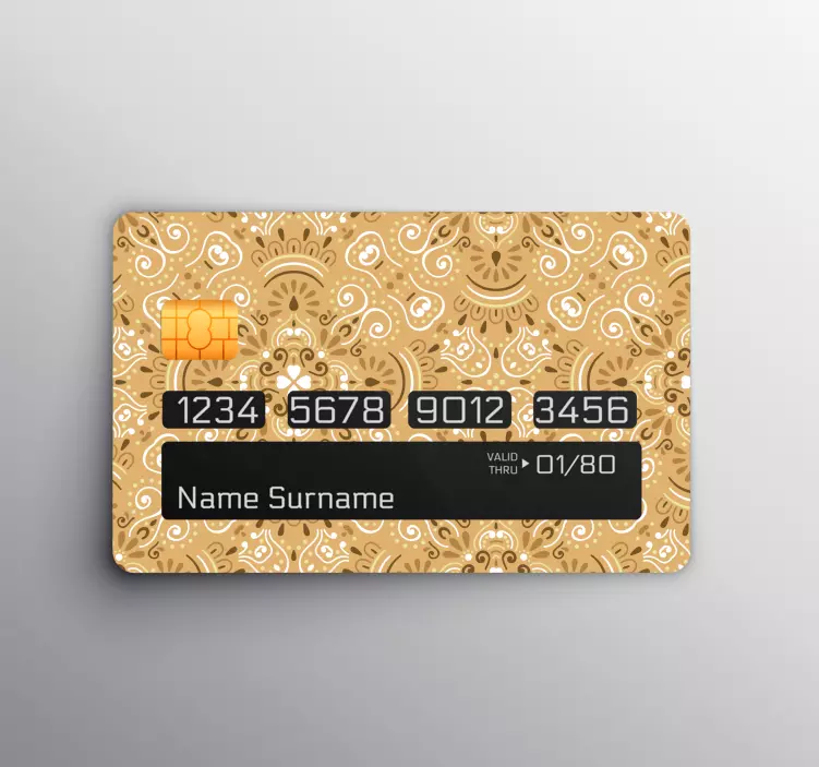 Entdecken Sie unseren Kreditkarte Aufkleber mit kunstvollem Muster, der Ihr Zahlungsmittel in ein elegantes Kunstwerk verwandelt! Mit einem beigen Hintergrund und aufwendigen Mustern sorgt dieser dekorative Aufkleber für eine stilvolle Note. Das durchdachte Design verleiht Ihrer Kreditkarte eine persönliche Note und hebt sich von der Masse ab.