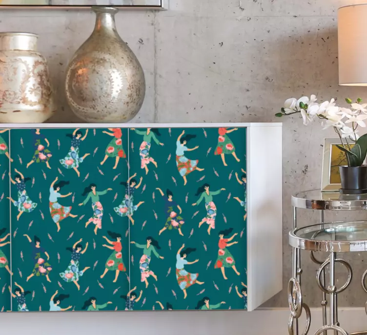 Die Möbelfolie fröhliches bewegungsmuster begeistert durch ein lebhaftes und dynamisches Design, das Frauen beim Tanzen zeigt und mit bunten, abstrakten Mustern sowie Zahlen versehen ist. Dieses Produkt bringt eine festliche Atmosphäre in jeden Raum und verwandelt Ihre Möbel in echte Hingucker, die Freude und Lebenslust ausstrahlen!