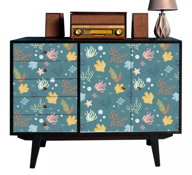 Die Möbelfolie korallenriff-motiv ist ein wahrhaft atemberaubendes Design, das das Leben im Meer widerspiegelt. Mit lebendigen Farben und einem faszinierenden Muster aus Korallen, Seesternen und sprudelnden Bläschen bringt diese Folie die zauberhafte Unterwasserwelt direkt in Ihr Zuhause. Die harmonische Kombination aus bunten Pflanzen und marinen Elementen verleiht jeder Umgebung einen frischen, lebendigen Touch und lässt die Fantasie der Betrachter erblühen!