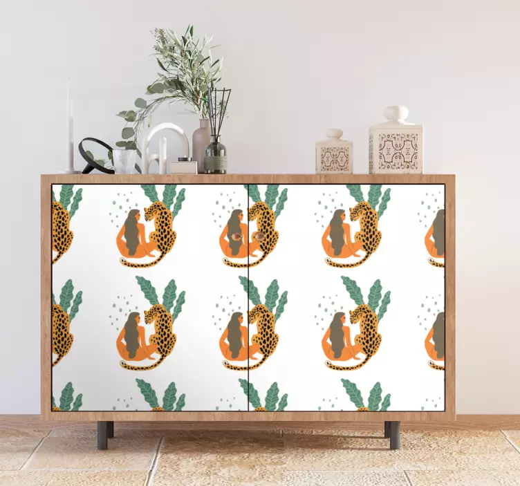 Die Möbelfolie leoparden pflanzenmotiv vereint eine faszinierende Darstellung von Frau, Leopard und handgemalten Pflanzen. Dieses wunderliche Design bringt die Tropen in Ihr Zuhause und verwandelt jede Möbeloberfläche in ein Kunstwerk der Natur. Die harmonischen Muster und lebendigen Farben erwecken eine tierische Eleganz und laden dazu ein, die Schönheit der Tierwelt und der Pflanzen in Ihrem Wohnraum zu feiern.