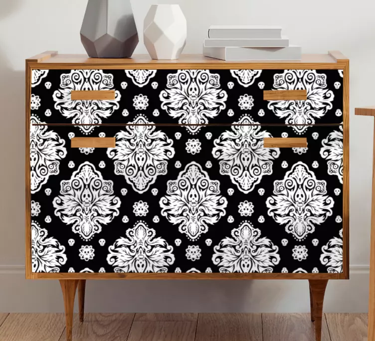 Die Möbelfolie mit elegantem Musterüberzug ist ein beeindruckendes Design-Element, das Ihre Inneneinrichtung auf ein neues Niveau hebt. Mit kunstvollen Mustern, die von Schädeln über Blumen bis hin zu Damast reichen, bietet diese Folie eine harmonische Verbindung von modernem Stil und zeitloser Eleganz. In einem schlichten Schwarz und Weiß gehalten, verleiht sie jedem Möbelstück das gewisse Etwas und strahlt eine aufwendige Ästhetik aus, die sowohl für Wohnzimmer als auch für Schlafzimmer ideal ist.