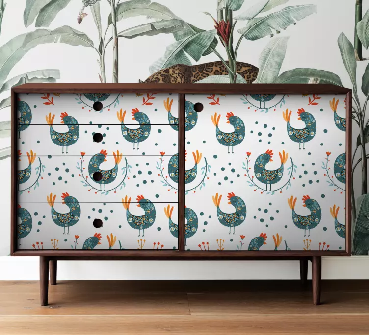 Entdecken Sie die faszinierende Möbelfolie mit lebhaftem hahn-motiv, die Ihr Zuhause in ein farbenfrohes Paradies verwandelt! Das verspielte Design zeigt lebendige Hühner und Blumenmuster, die harmonisch miteinander kombiniert sind und so eine einladende Atmosphäre schaffen. Diese kreative Illustration von Nutztieren und Tieren bringt nicht nur Farbe in Ihre Räume, sondern sorgt auch für Freude und Lebensfreude in jedem Winkel Ihrer Einrichtung.