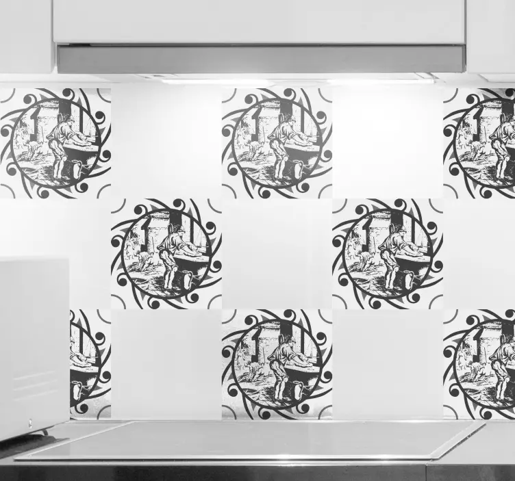Entdecken Sie die faszinierende Welt der Objekt Aufkleber vintage bastelszene, die mit ihrem einzigartigen Design bestechen. Diese künstlerischen und abstrakten Aufkleber zeigen eindrucksvoll Backen, Personen und Fliesen in einem harmonischen Schwarz-Weiß-Konzept. Die Gravuren verleihen den Aufklebern eine besondere Tiefe und machen sie zu einem absoluten Highlight für Ihre Bastelszenen.
