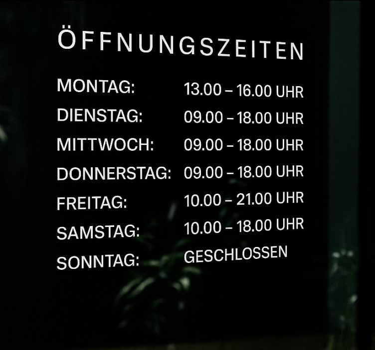 Die Öffnungszeiten Öffnungszeiten sind nicht nur funktional, sondern auch ein stilvolles Deko-Element, das jedem Raum eine persönliche Note verleiht. Sie schaffen nicht nur Klarheit über Ihre Öffnungszeiten, sondern machen dies auf eine ästhetische Weise, die Ihre Kunden inspirieren wird. Mit diesem Produkt setzen Sie ein Zeichen für Professionalität und Gastfreundschaft, das in jedem Geschäftsumfeld geschätzt wird. Verleihen Sie Ihrem Raum mit diesem Design einen Hauch von Eleganz und Stil!