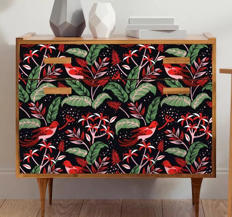 Referenz: A53481Ein lebhaftes tropisches Blumenmuster mit roten Vögeln und üppigen grünen Blättern vor einem dunklen Hintergrund. Das Design kombiniert verschiedene Blümenelemente mit lebhaften Farben und schafft eine energiegeladene und frische Atmosphäre, die perfekt ist, um jedem Raum einen Hauch von Natur zu verleihen.