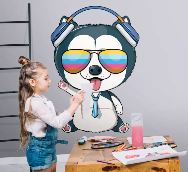 Entdecken Sie das Wandtattoo Haustier cooler Tiercharakter, das mit einem fröhlichen Hund und einem süßen Welpen begeistert, die beide mit Sonnenbrillen und Kopfhörern versehen sind. Dieses humorvolle und farbenfrohe Design bringt Spaß und musikalische Freude in jeden Raum und zaubert jedem Betrachter ein Lächeln ins Gesicht. Die Karikaturform und die spielerischen Elemente machen das Wandtattoo zu einem echten Hingucker!