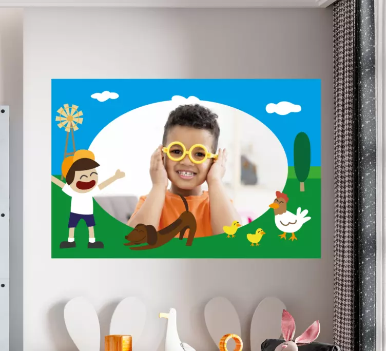 Entdecken Sie unser bezauberndes Wandtattoo Kinderzimmer verspielt auf dem Bauernhof, das die Fantasie Ihrer Kleinen anregt! Das Design zeigt fröhliche Karikaturen von Kindern, lustigen Tieren und bunten Bildern innerhalb eines liebevollen Rahmens. Dieser Bilderrahmen bringt den Bauernhof direkt ins Kinderzimmer und sorgt für ein wunderliches, spaßiges Ambiente, das zum Spielen und Träumen einlädt!