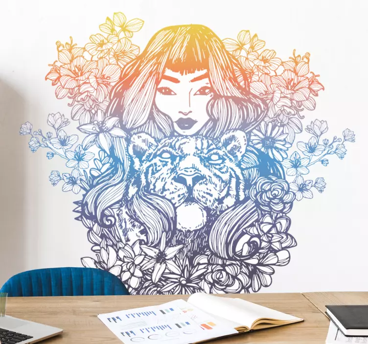 Entdecken Sie das faszinierende Wandtattoo Menschen Frau mit Tiger, das mit einem einzigartigen Design begeistert. Die keltischen Elemente verbinden sich harmonisch mit der Darstellung einer starken Frau, während der majestätische Tiger in Kombination mit zarten Blumen und lebendigen Farben eine eindrucksvolle Atmosphäre schafft. Die feinen Strichzeichnungen und sanften Gradienten verleihen diesem Kunstwerk eine besondere Tiefe, die jeden Raum verwandelt.