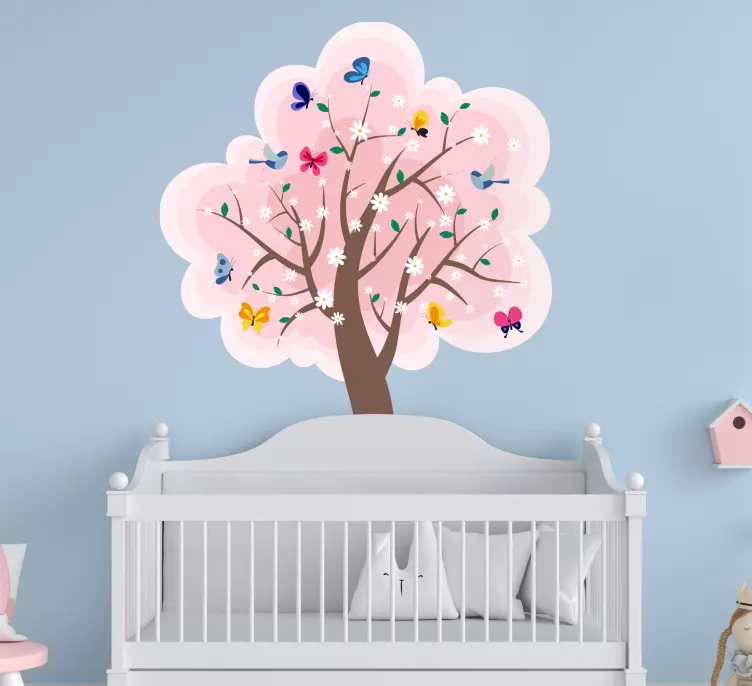 Referenz: A48286Ein lebendiger Baum in voller Blüte ist mit bunten Schmetterlingen und zarten Blumen geschmückt. Diese fröhliche Szene fängt die Schönheit der Natur ein und ist perfekt, um jedem Raum einen verspielten Touch zu verleihen. Die Kombination aus pinken Blüten und verspielten Schmetterlingen schafft eine bezaubernde Atmosphäre.