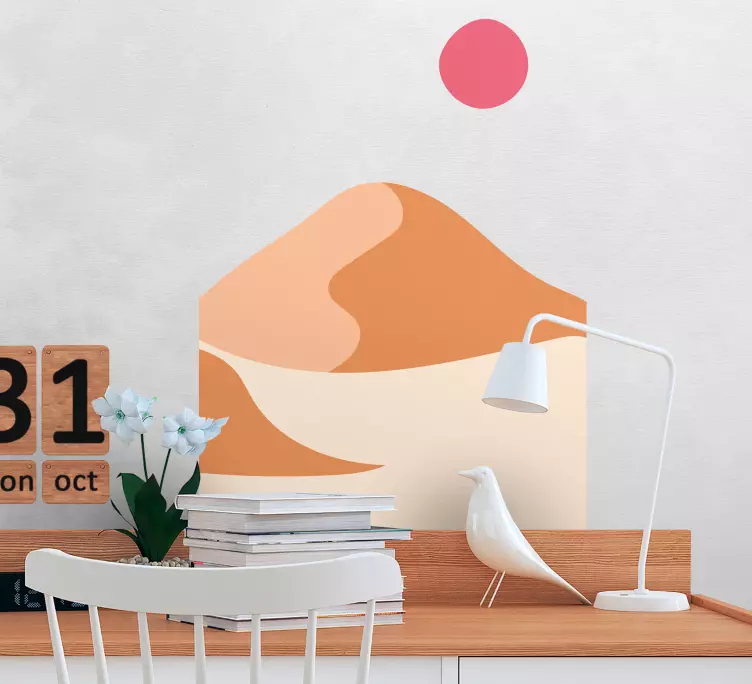 Verleihen Sie Ihren Wänden mit unserem Wandtattoo Ornament abstrakte sanddünen eine einzigartige Note! Das Design besticht durch eine harmonische Darstellung von Bergen, Illustrationen und einer abstrakten Komposition, die die Sonne über sanften Sand Dünen in der Natur einfängt. Die minimalistische Ästhetik schafft eine ruhige und entspannende Atmosphäre in jedem Raum!