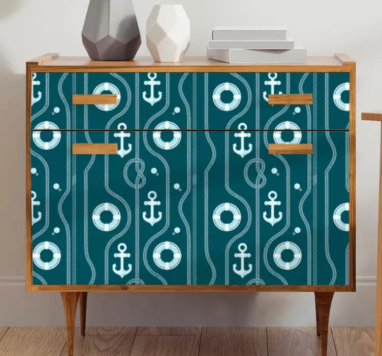 Referenz: A49487Mit einem charmanten maritimen Thema integriert dieses Design Anker und Rettungsringe, die in einem rhythmischen Muster angeordnet sind. Die Kombination aus Linien und kreisförmigen Elementen vermittelt ein maritimes Gefühl, ideal zur Aufwertung eines von der Küste inspirierten Raums.
