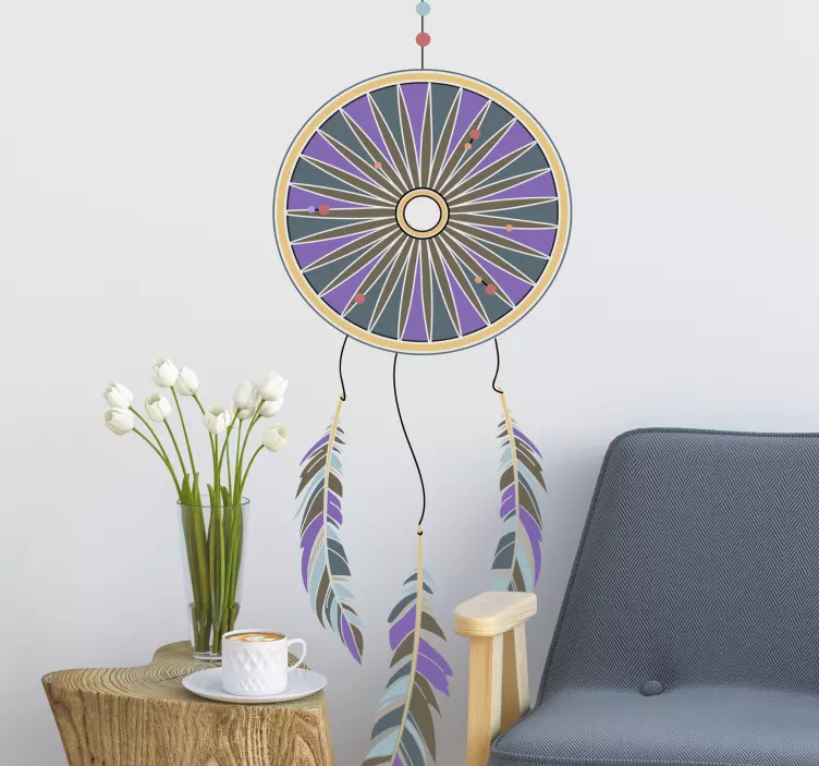 Verleihen Sie Ihrem Raum mit unserem einzigartigen Wandtattoo Ornament Traumfänger Konzept einen Hauch von Boho-Chic. Die kunstvolle Illustration zeigt einen wunderschönen Traumfänger in lebendigen lila und violetten Tönen, umgeben von zarten Federn und geometrischen Mustern. Dieses farbenfrohe Design bringt nicht nur Farbe in Ihr Zuhause, sondern auch eine beruhigende Atmosphäre, die zum Träumen einlädt!