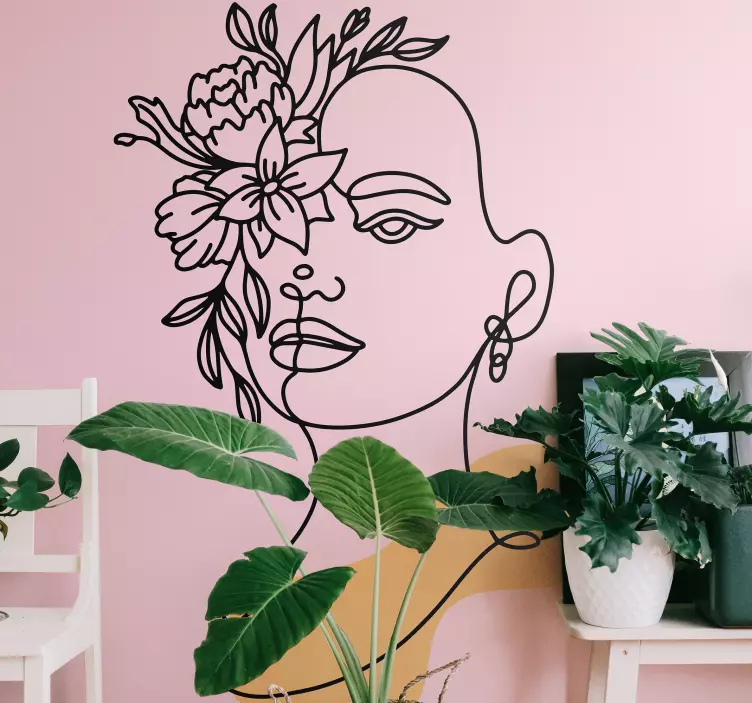 Referenz: A51291Eine fesselnde Darstellung mit einer minimalistischen Linienzeichnung eines FrauenGesichts, das mit verschiedenen Blumen geschmückt ist. Diese Komposition verbindet Weiblichkeit und Natur und schafft einen harmonischen Fokus auf Schönheit und Eleganz, perfekt geeignet, um jeden WohnRaum mit einem Hauch von Kunst zu bereichern.