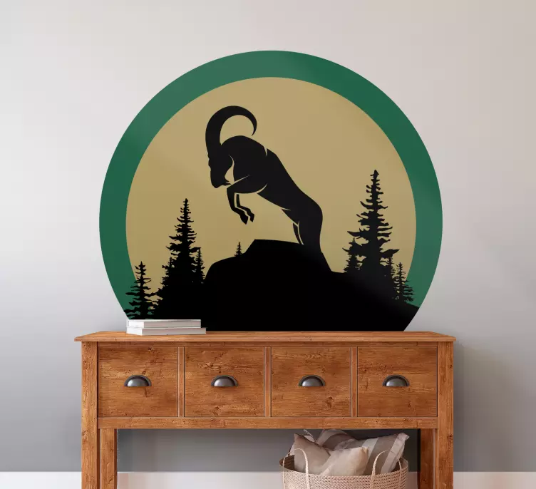Referenz: A48507Eine auffällige Silhouette eines Bergziegen, die mitten im Sprung eingefangen wurde, umgeben von hoch aufragenden Bäumen, vor einem sanft gefärbten, kreisförmigen Hintergrund. Dieses Design weckt ein Gefühl von Abenteuer und die Essenz der Tierwelt, perfekt für diejenigen, die von der Natur und der freien Natur inspiriert sind.