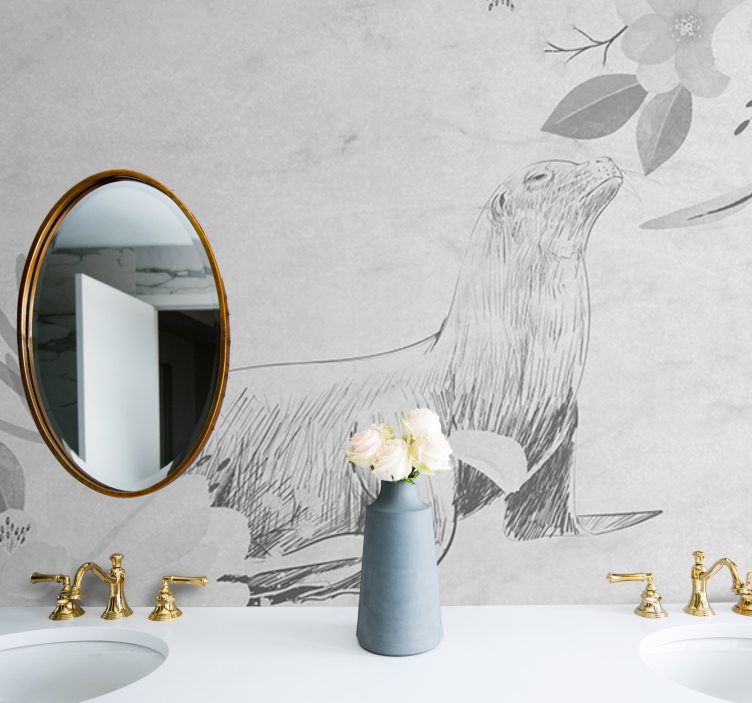 Entdecken Sie die bezaubernde Fototapete Badezimmer Seehund unter Blumen, die mit ihrem einzigartigen Design aus einem niedlichen Siegel, einer filigranen Zeichnung in Graustufen und floralen Elementen die natürliche Schönheit in Ihr Badezimmer bringt. Diese harmonische Kombination von Tier- und Blumenelementen schafft eine einladende Atmosphäre, die Ihren Raum in einen Ort der Entspannung verwandelt.
