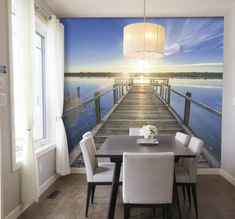 Die Fototapete Landschaft Pier Sonnenuntergang Aussicht ist die perfekte Wahl, um jedem Raum eine einladende und entspannende Atmosphäre zu verleihen. Ihr ansprechendes Design begeistert nicht nur die Augen, sondern erzeugt auch eine emotionale Verbindung zur Natur. Durch die harmonische Darstellung des Sonnenuntergangs wird jeder Raum in ein stilvolles Refugium verwandelt, das sowohl zum Entspannen als auch zum Verweilen einlädt. Bringen Sie mit dieser Fototapete die Schönheit der Natur direkt in Ihr Zuhause!