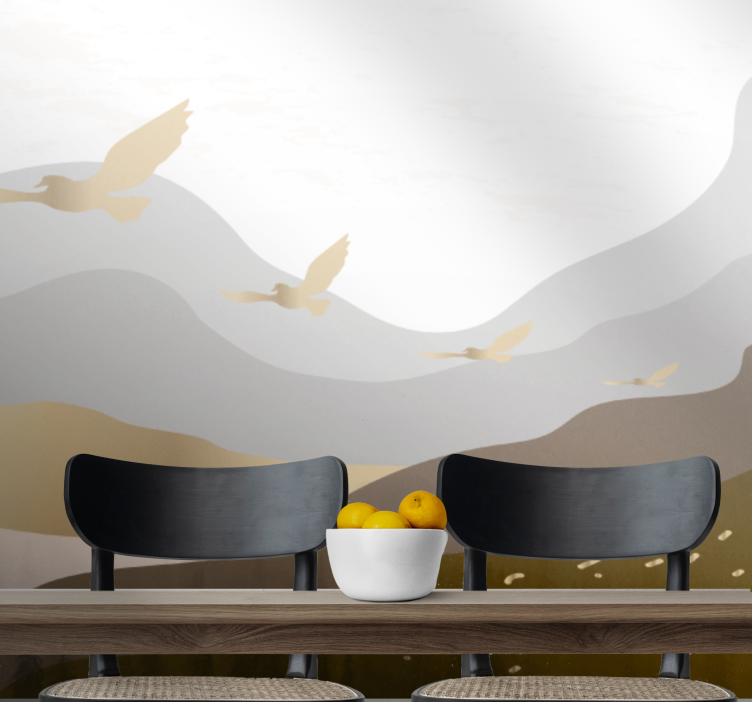 Erleben Sie die Schönheit der Natur mit unserer Fototapete wald mit fliegenden vogelsilhouetten. Diese atemberaubende Illustration zeigt majestätische Berge im Hintergrund und fliegende Vögel, die die Silhouetten der Natur perfekt zur Geltung bringen. Die goldenen Akzente verleihen dem Design einen Hauch von Eleganz und machen es zu einem echten Blickfang in jedem Raum. Die harmonische Verbindung von Vögeln, Bergen und Natur schafft eine beruhigende Atmosphäre, die zum Träumen einlädt.