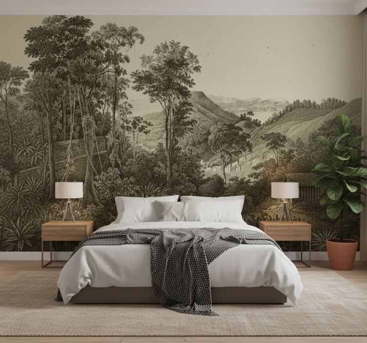 Die Tapete Wald Tapete Wald Hügellandschaft Druck ist die perfekte Wahl, um eine beruhigende Atmosphäre zu schaffen. Sie bringt die Schönheit der Natur in Ihre vier Wände und sorgt für eine einladende Umgebung. Die matten Farben und die detailreiche Landschaftsabbildung schaffen einen Raum, der zum Verweilen einlädt und Ihr Zuhause in einen Rückzugsort verwandelt.