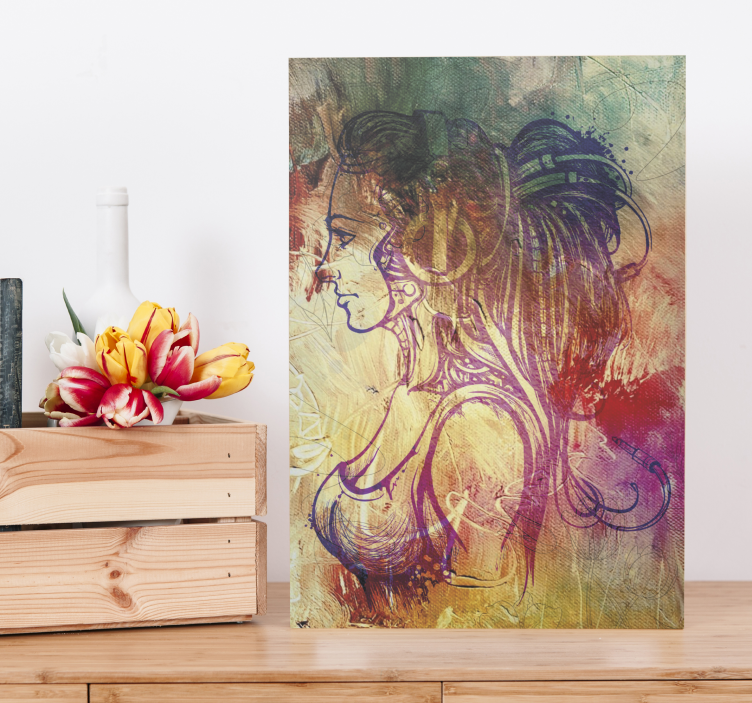 Referenz: Q6417Eine fesselnde Profil-Silhouette einer Frau mit fließendem Haar, kunstvoll illustriert vor einem strukturierten Hintergrund. Das Design fängt das Wesen der Weiblichkeit ein und zeigt dabei detaillierte Linienführung und lebendige Farbtupfer, die eine harmonische Mischung aus Kunstfertigkeit und Ausdruck schaffen.