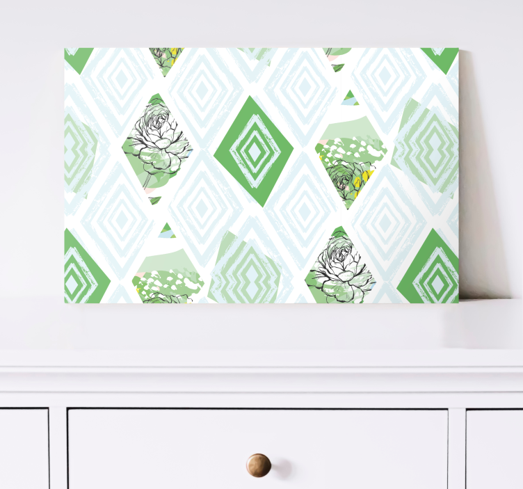 Entdecken Sie das Leinwandbild geometrisches sukkulentenmuster, das mit seinem faszinierenden Design begeistert! Die harmonische Kombination aus bunten Blumen und geometrischen Formen wie Diamanten und Rhombus bildet ein einzigartiges Kunstwerk. Die frischen Grüntöne und die Abstraktion der saftigen Pflanzen verleihen jedem Raum eine natürliche und beruhigende Atmosphäre. Dieses Kunstwerk ist nicht nur ein Blickfang, sondern bringt auch eine positive Energie in Ihr Zuhause!