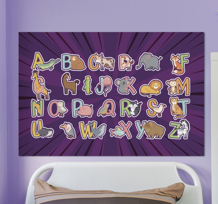Referenz: Q6433Mit einer verspielten Auswahl an Tieren, die ihren entsprechenden Buchstaben zugeordnet sind, fördert dieses Design das frühe Lernen. Jeder Charakter ist lebhaft illustriert, zieht die Aufmerksamkeit auf sich und regt zur Interaktion an. Das dynamische Muster des Hintergrunds verstärkt die lebhafte Atmosphäre und macht es zur idealen Wahl für Kinderbereiche.