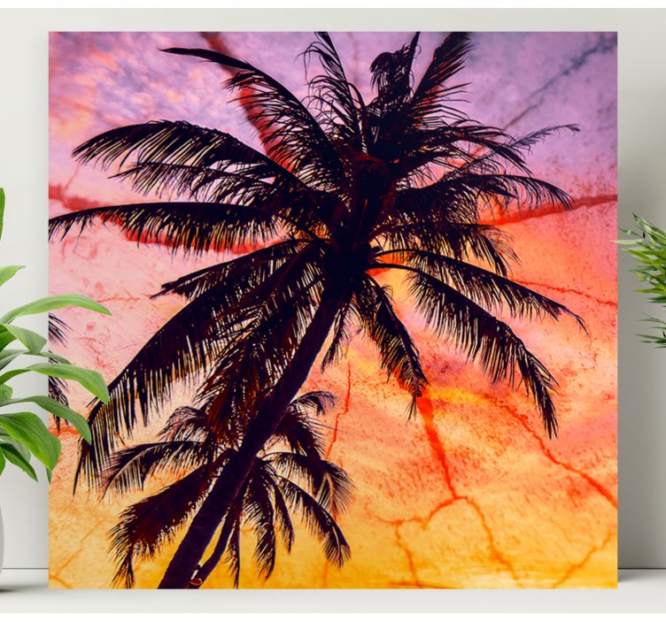 Referenz: Q6828Ein Auffälliger Blick auf die silhouettierten Palmen fängt das Wesen eines ruhigen Sonnenuntergangs ein. Die filigranen Details der Blätter heben sich vor einem lebendigen Hintergrund hervor und zeigen die Schönheit der Natur. Dieses fesselnde Bild weckt Gefühle der Entspannung und Wärme und lädt ein, sich eine friedliche tropische Flucht vorzustellen.