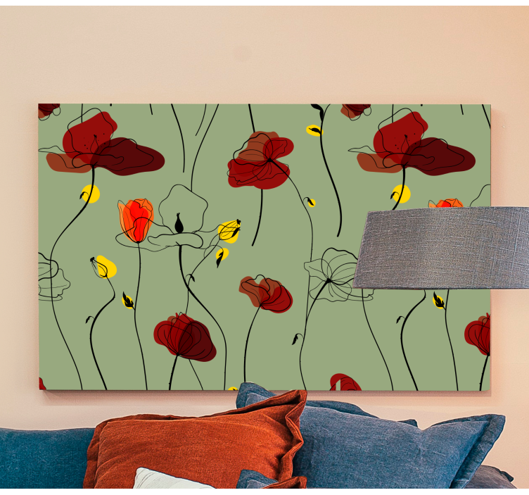 Referenz: Q6897Dieses komplexe Design zeigt ein zartes Arrangement von Mohnblumen in Rot, Gelb und Weiß vor einem sanften grünen Hintergrund. Die fließenden Linien und organischen Formen schaffen eine dynamische Komposition, die ein Gefühl von Bewegung und Leben evoziert, perfekt, um einen frischen Hauch von Natur ins Innere zu bringen.
