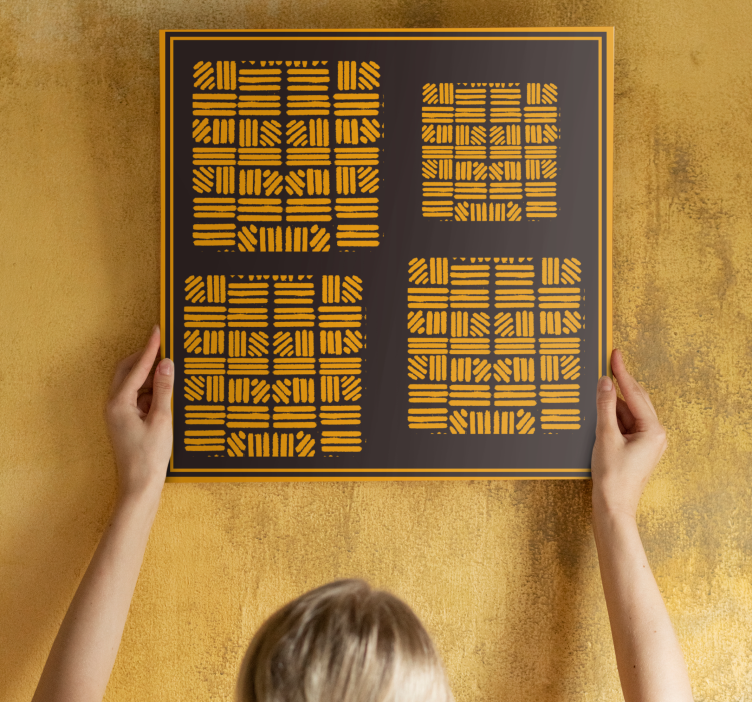 Entdecken Sie unser Wandbilder modern geometrisches anordnungskonzept, das mit einem faszinierenden afrikanischen Design begeistert. Die Kombination aus Gold, golden und Gelb schafft eine harmonische Atmosphäre, während die klaren Linien und Formen in diesem abstrakten Kunstwerk ein Gefühl von Ordnung und Eleganz vermitteln. Jedes Bild ist sorgfältig in einem Bilderrahmen gerahmt und zieht alle Blicke auf sich, egal wo es platziert wird. Die geometrischen Netze fügen sich nahtlos in jeden Raum ein und verleihen Ihrer Dekoration einen modernen Touch!