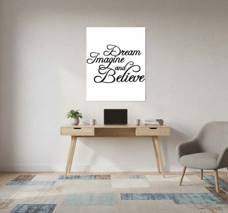 Referenz: G692Verleihen Sie Ihrem Büro mit unserem Poster Büro Träume Stelle Dir Vor und Glaube einen inspirierenden Touch! Dieses Poster besticht durch ein einzigartiges Design, das sowohl moderne als auch klassische Elemente kombiniert. Mit einer Grammatur von 180 g/m² und einem halbmattierten Finish sorgt es für hohe Farbintensität und minimiert Reflexionen, was die Botschaft klar und deutlich hervorhebt.