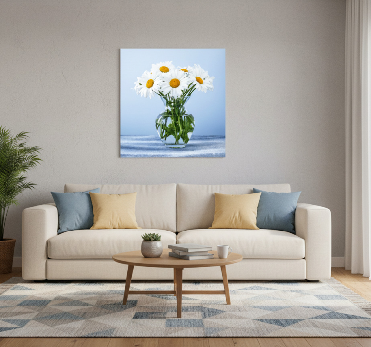 Das Poster Wohnzimmer mit Gänseblümchen in Gläsern bringt eine fröhliche Atmosphäre in Ihr Zuhause. Es ist eine wunderbare Möglichkeit, Ihren Wohnraum aufzuhellen und ihm eine persönliche Note zu verleihen. Die lebendigen Farben und das ansprechende Design machen es zu einem echten Hingucker und sorgen dafür, dass Ihre Wände nicht leer bleiben. Lassen Sie sich von der Schönheit der Natur inspirieren und kreieren Sie einen einladenden Raum, der zum Entspannen einlädt!