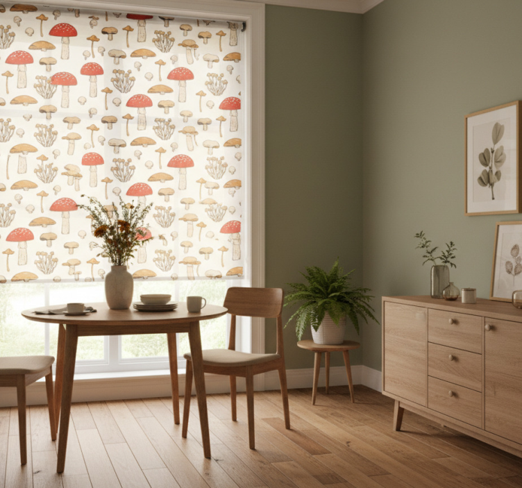 Rollo esszimmer mit gelben und roten pilzen und blumen