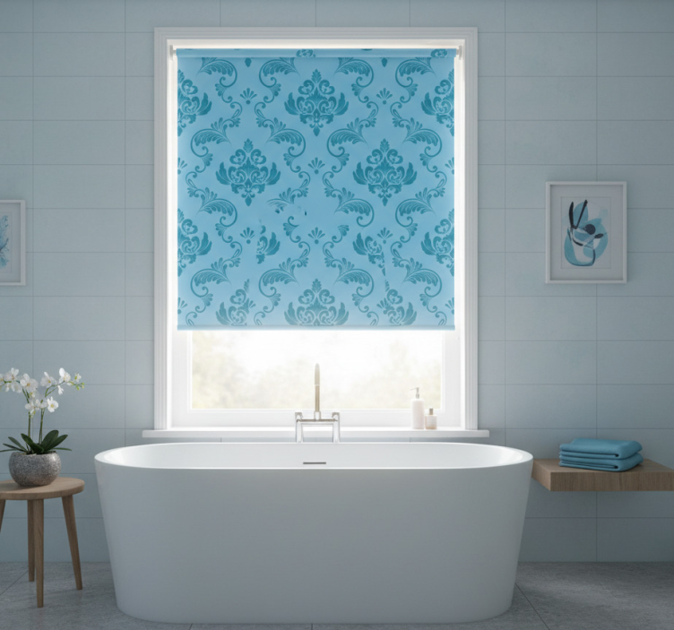 Rollo fenster badezimmer mit blauen botanischen kurven