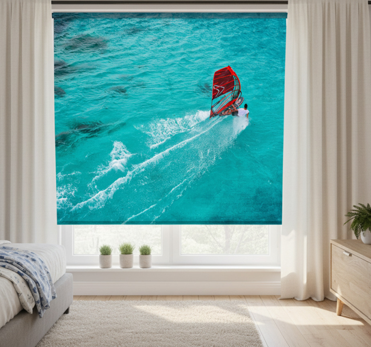 Referenz: E8820Entdecken Sie das einzigartige Design unseres Rollo Fenster Blau windsurfer auf dem wasser, das nicht nur funktional, sondern auch ästhetisch ansprechend ist. Die harmonische Kombination aus sanften Blautönen und einem dynamischen Windsurf-Motiv bringt die frische Brise des Wassers direkt in Ihr Zuhause. Dieses dekorative Element verwandelt jeden Raum in eine entspannende Oase und sorgt gleichzeitig für eine optimale Lichtregulierung.