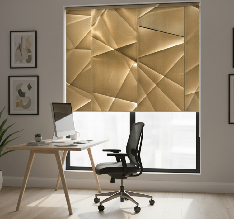 Referenz: E7382Entdecken Sie das Rollo Fenster Home Office mit 3D goldener Polygontextur, ein einzigartiges Design, das Eleganz und Funktionalität miteinander vereint. Die faszinierende polygonale Struktur in Gold bringt einen Hauch von Luxus in Ihr Home Office und verwandelt jeden Raum in eine stilvolle Oase. Dieses Rollo schützt nicht nur vor direkter Sonneneinstrahlung, sondern bietet auch eine hervorragende Privatsphäre, sodass Sie ungestört arbeiten können. Darüber hinaus ist es einfach zu reinigen und ermöglicht eine mühelose Anpassung an Ihre individuellen Bedürfnisse.