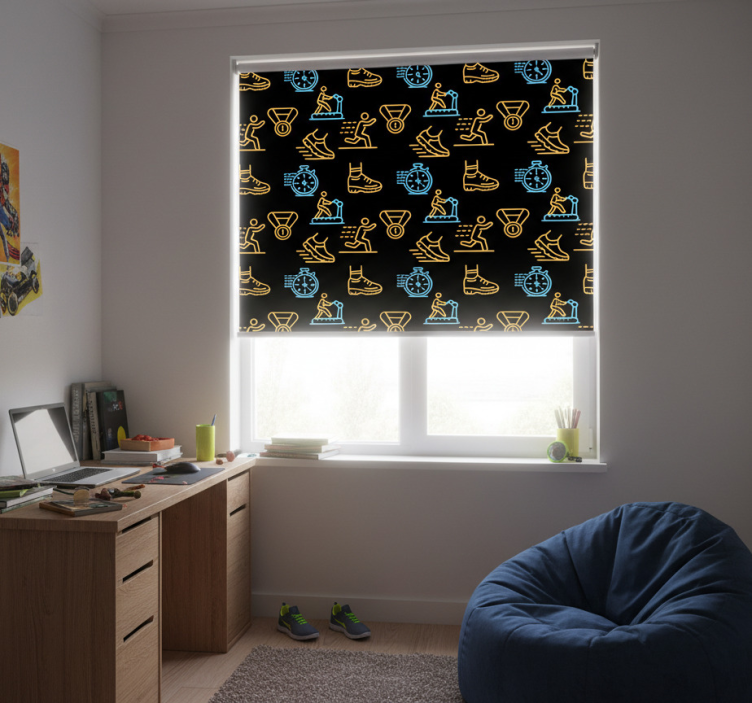 Rollo fenster jugendzimmer mit leuchtenden icons auf schwarz