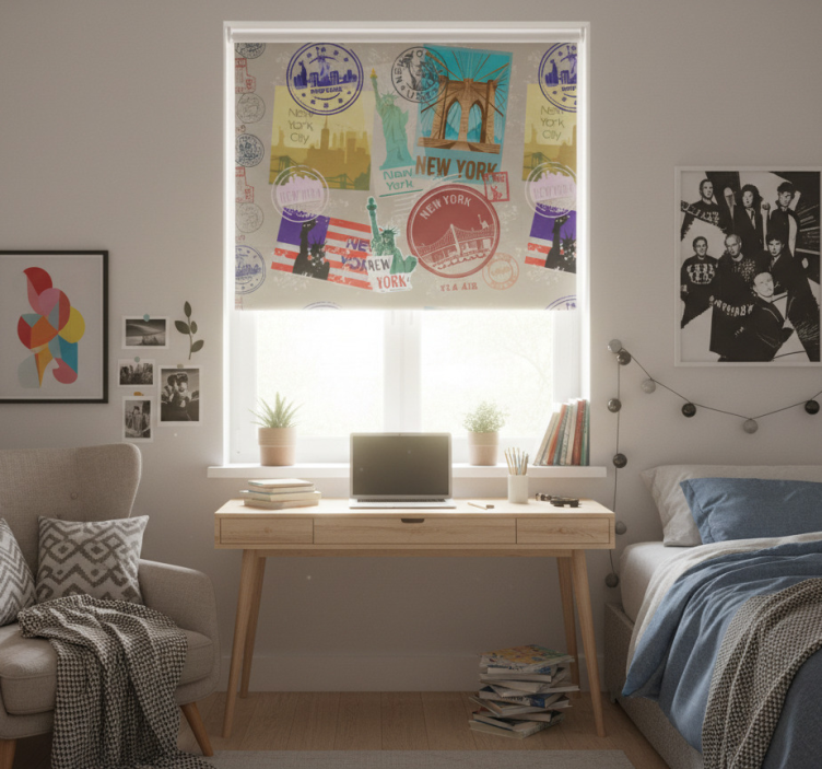 Rollo fenster jugendzimmer mit nyc sticker collage