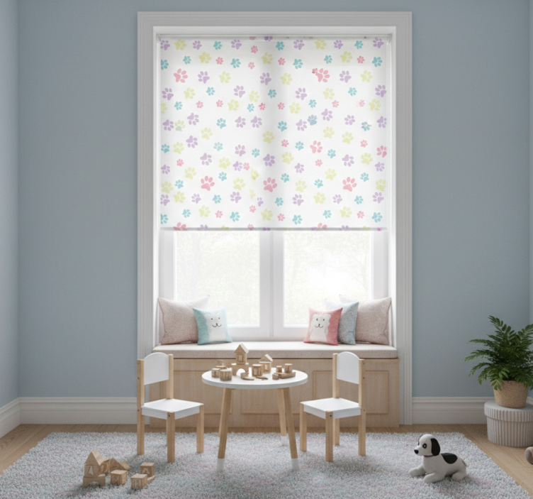 Rollo fenster kinderzimmer mit bunten hundepfoten