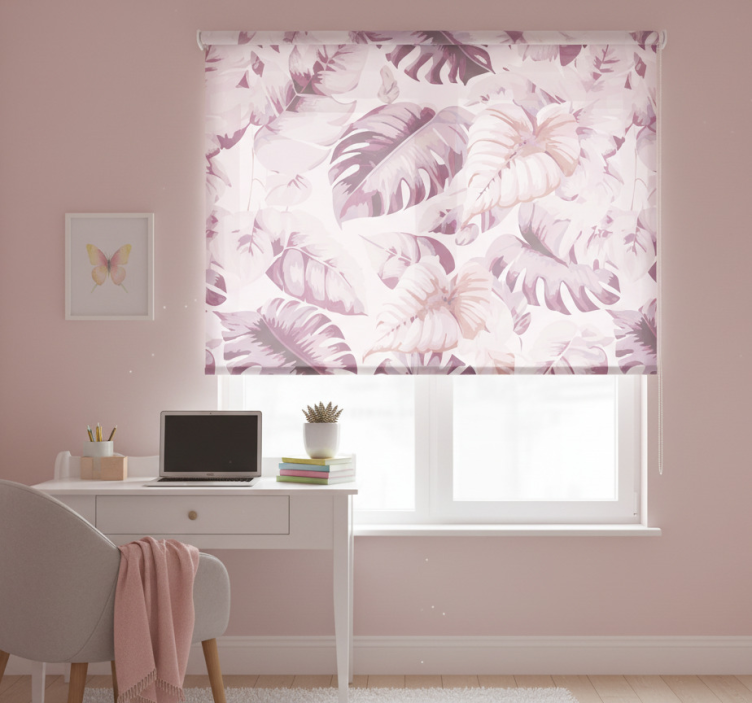 Rollo fenster rosa mit großen tropischen blättern