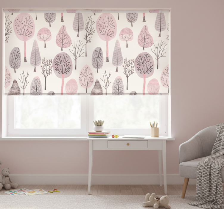 Rollo fenster rosa mit nordischen bäumen