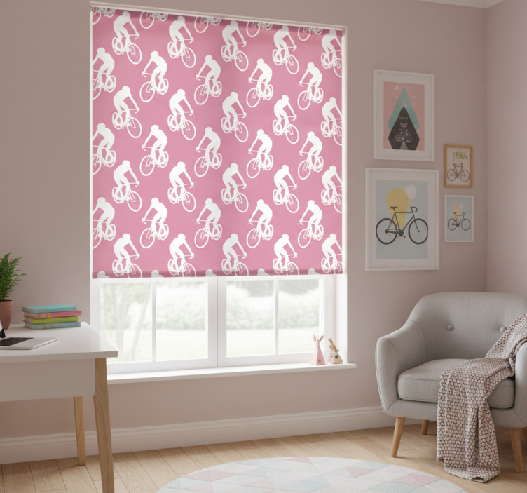 Rollo fenster rosa mit weißem radfahrer-muster
