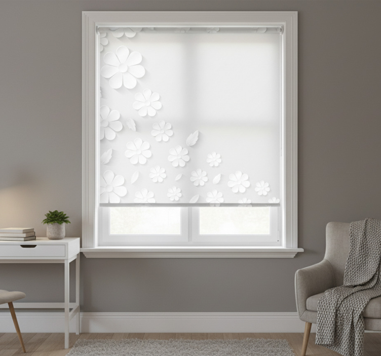 Rollo fenster weiß mit weißem papierblumen hintergrund
