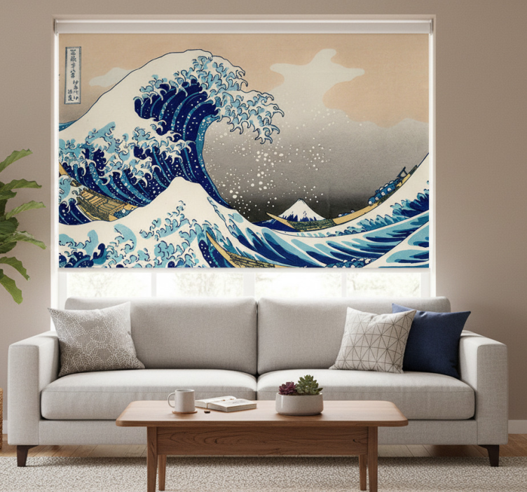 Das Rollo Wohnzimmer Hokusai Welle Fototapete ist mehr als nur ein einfacher Sichtschutz; es verwandelt Ihre Wände in ein Meisterwerk der Kunst. Mit seiner einzigartigen Darstellung der Wellen bringt es Bewegung und Leben in jeden Raum. Die harmonischen Farben und die dynamische Gestaltung schaffen eine inspirierende Atmosphäre, die sowohl entspannend als auch belebend wirkt. Lassen Sie Ihr Wohnzimmer zu einem Ort der Kreativität und des Wohlbefindens werden!