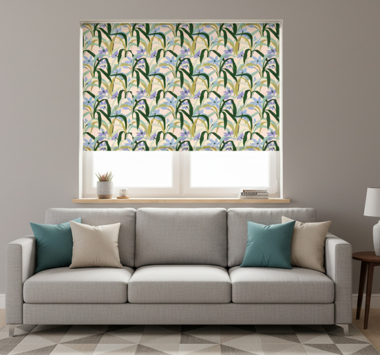 Rollo wohnzimmer mit buntem abstraktem blättermuster